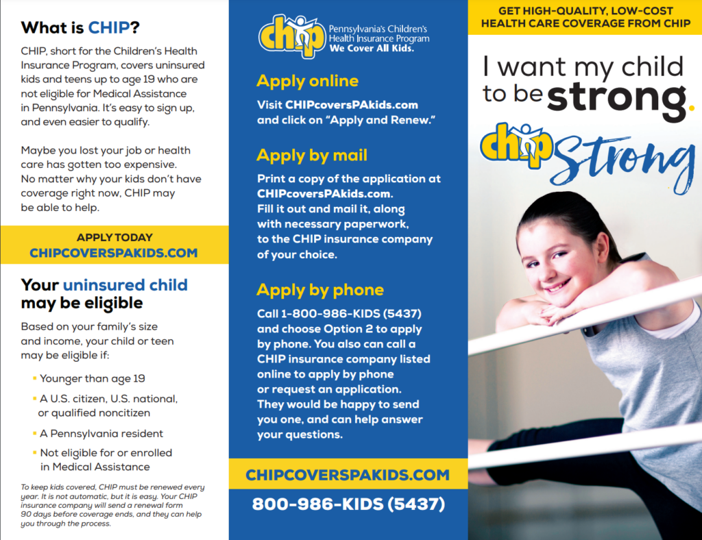 What is CHIP? CHIP, short for the Children’s Health Insurance Program, covers uninsured kids and teens up to age 19 who are not eligible for Medical Assistance in Pennsylvania. It’s easy to sign up, and even easier to qualify. Maybe you lost your job or health care has gotten too expensive. No matter why your kids don’t have coverage right now, CHIP may be able to help.